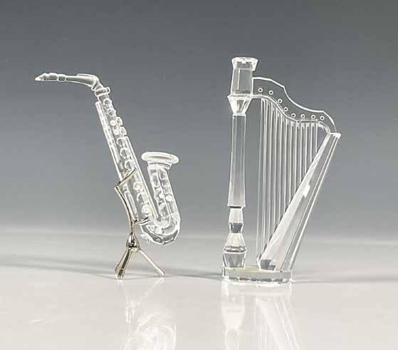 A lead crystal instrument figures comprising of a harp and saxophone with stand. Both were part of the Crystal Melodies and are made from clear crystal. Swarovski etched backstamp. Harp measures: 2”L x 1.25”W x 4”H. Saxophone measures: 1.75”L x 1.25”W x 4.25”H.