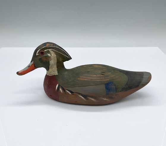 Vintage small hand carved figure of a waterfowl. The hand painted details indicates that this figure is a drake. Light brown acrylic eyes. Artist signed and titled.
