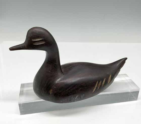 Hand carved glossy glaze figure of a duck with hollow eyes. Artist signed and dated.