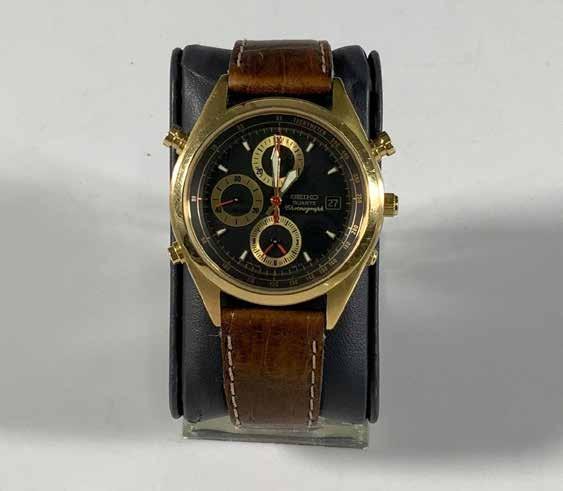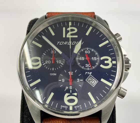 This watch has quartz movement, stainless steel case, and a fixed tachymeter bezel, chronograph subdials, and a mineral crystal face. The full length with the brown leather band is approximately 10.5”L. Water resistant 100m. Functionality not guaranteed.