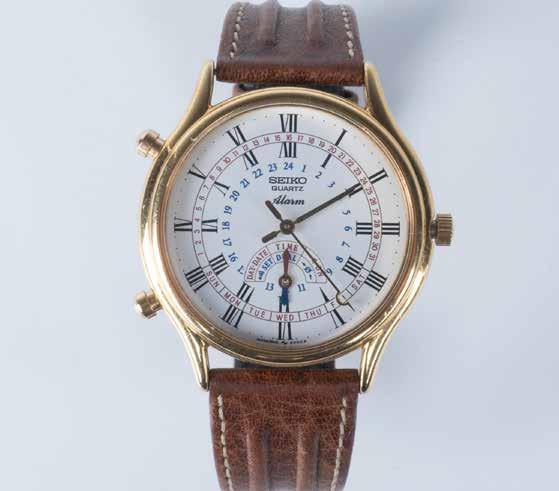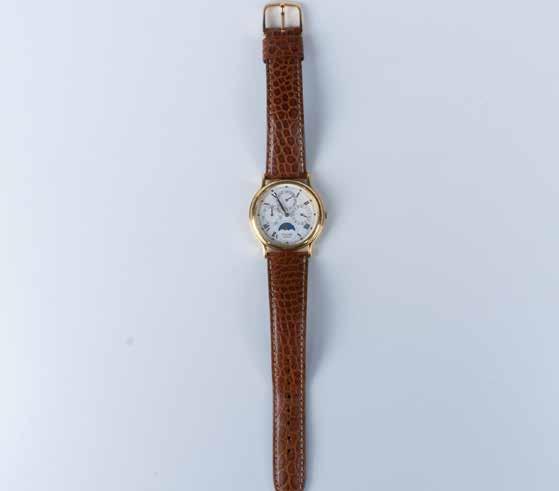 This watch has Swiss movement with a golden stainless steel case and back. The dial has roman numerals and month, day, and date sub-dials with a moon phase tracker. 30m water resistant. The total length including the brown leather strap measures approximately 10”L. Dimensions: 43mm
