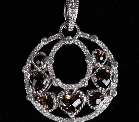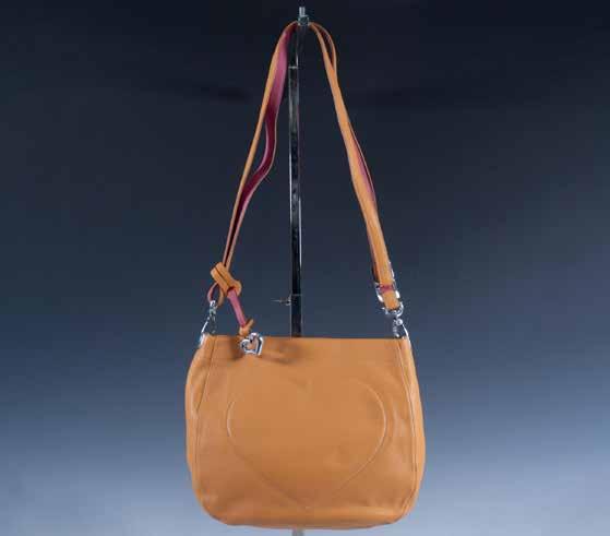 Soft leather with stitched heart design, accents of saddle brown, magnetic closure and top handles with silver-toned hardware. Canvas floral interior with zippered compartment. Brighton embossed tag C796853. Mini purse replica key chain included.