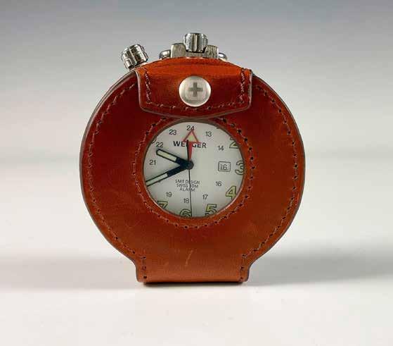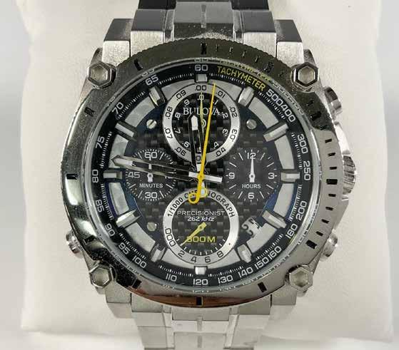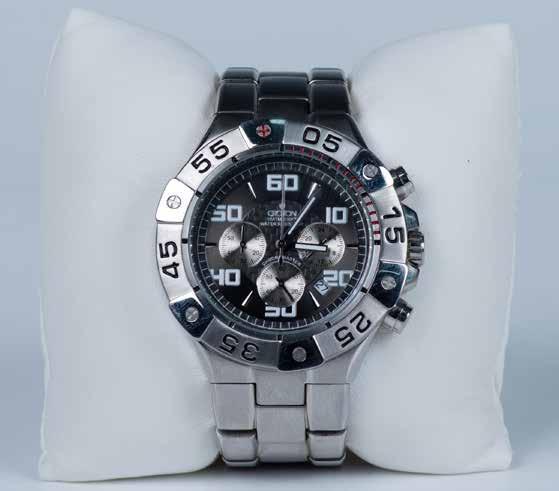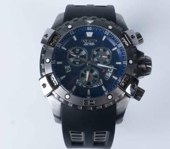 This watch has Swiss quartz movement and a stainless steel case with screw down crown and flame fusion crystal. The band measures approximately 10”L x 1”W. Water resistant 200m. Functionality not guaranteed.