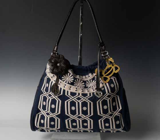 Navy canvas with white embroidered geometric patterns and flowers. Dark brown leather trim and straps. Interior pockets, zippered middle section and magnetic closure top. Length of shoulder straps is 12”L. Brighton leather patch stitched on the inside with registration number U077400.