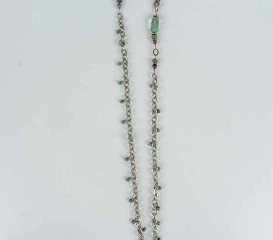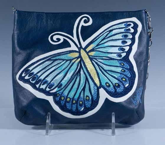 This stunning crossbody bag features a beautiful polychrome embroidered butterfly front and light blue leather back. Zippered top opens to fabric lining and additional pockets. Leather and chain shoulder strap. Dust bag included.