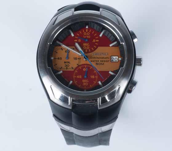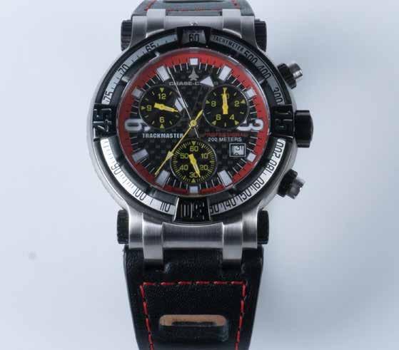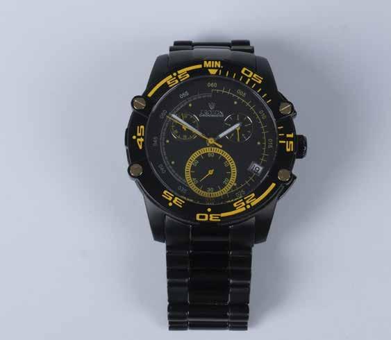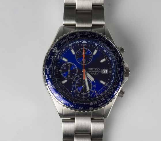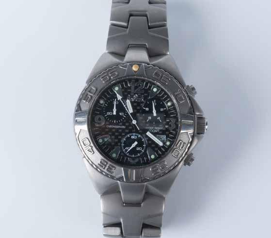 This watch has a titanium case and bracelet. It three sub-dials, a date display, and Swiss quartz function. It is water resistant 200m.