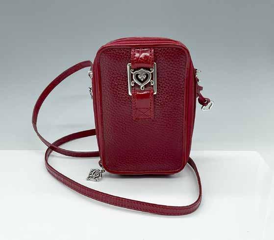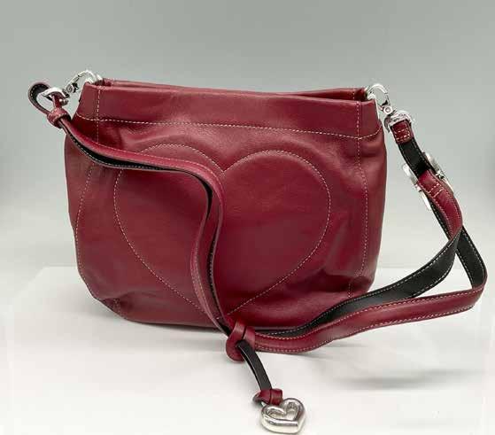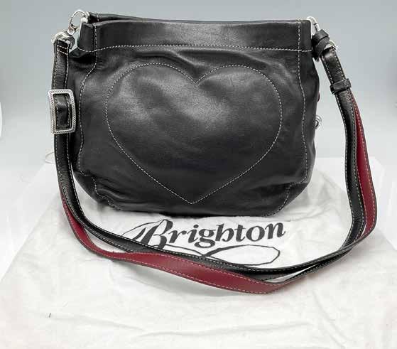 Soft leather with stitched heart design, accents of burgundy, magnetic closure and adjustable long shoulder strap with silver-toned hardware. Canvas floral interior with zippered compartment. Brighton embossed tag C552865. Dust bag included.