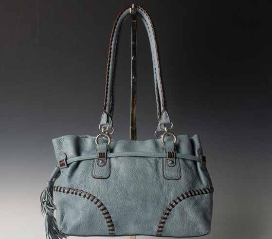 Light blue leather handbag with brown accents. Interior pockets and zipped sections with magnetic closure. Length of shoulder strap 9”L. Brighton leather patch stitched on the inside with registration number D394001.