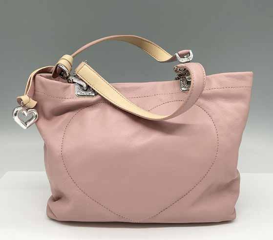 Soft leather with stitched heart design, accents of lavender, magnetic closure and top handles with silver-toned hardware. Canvas floral interior with zippered compartment. Brighton embossed tag C635196.