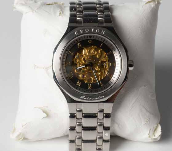 This stunning wristwatch has a brown padded croc leather strap. A rich dark brown base with gold numbers in a stainless steel case and case back. This item has its original box 4.5”W x 6”L x 3.5”H.