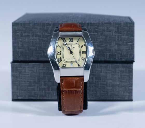 This sophisticated men’s wristwatch has a quartz face encased by a stainless steel back. The elegant strap is from the genuine python Swiss collection. The watch comes in a box that is 4.5”L x 6”W x 3”H.