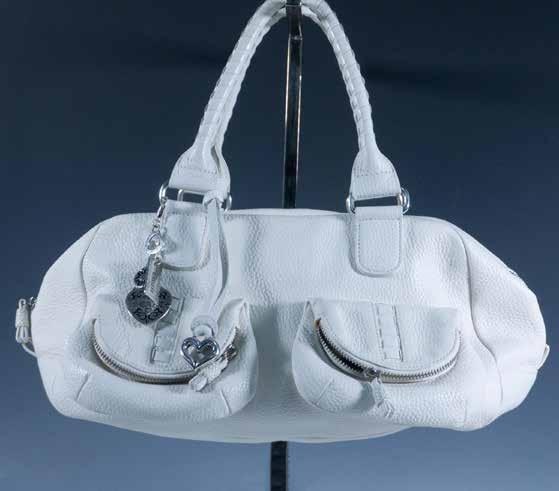 This luxurious white leather handbag is a dream! The zippered top opens to a colorful fabric lining with additional pockets. It features leather-wrapped handles and a Brighton embossed number U022941. Dust bag included.