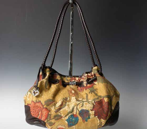 BRIGHTON CANVAS/LEATHER HANDBAG, FLOWERS, TAN/ RED/BLUE/BROWN