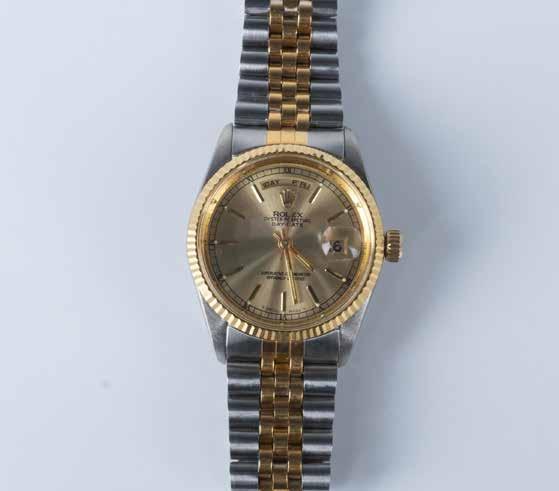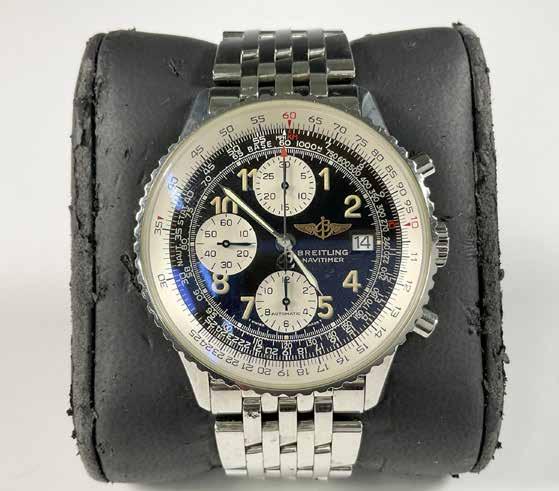 Gold tone stainless steel case, bezel, and band. Japan movement. Water resistant 50m. Band length: 9.50”L. Dial dimensions: 45mm. Box size: 5.50”L x 5”H x 6.50”W. Includes six extra links and cleaning cloth. Limited edition number on lower part of case: 165/3000. This item has its original box. Needs battery.
