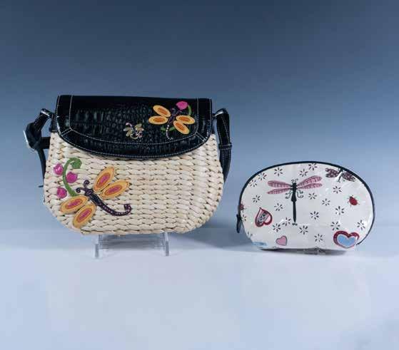 This whimsical dragonfly pair includes a natural woven basketstyle shoulder bag with black leather accents and leather dragonfly embellishments, along with a small dragonfly-themed pouch with protective plastic lining. The larger bag has a magnetic flap closure that opens to a fabric-lined interior with additional pockets and a leather shoulder strap. It features a Brighton embossed tag inside. Dust bag included. The largest bag measures 10” L x 3.25” W x 7.75” H.