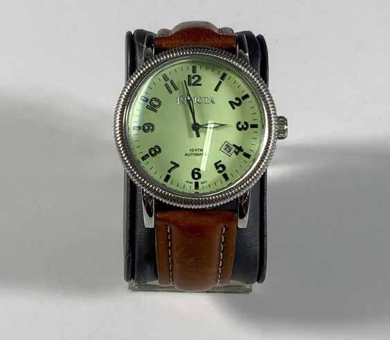 This watch has Japan movement, 21 jewels, a stainless steel case with transparent back, and scratch resistant crystal. Luminous dial and hands with black numbers and markers. 10 ATM water resistant. It has a brown leather band and the total length measures approximately 10”L. Functionality not guaranteed. Dimensions: 43mm