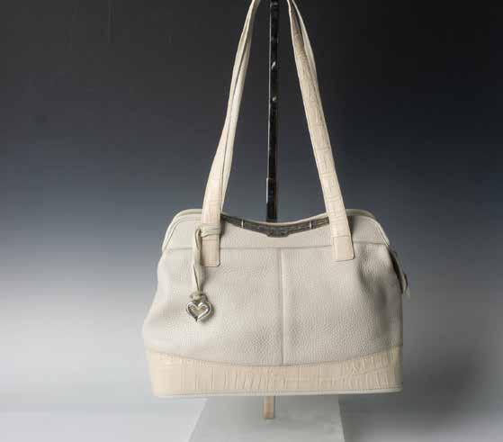 Pale beige leather handbag with cream bottom border and straps. Silver engraved accent piece. Interior pockets with zippered closure. Length of shoulder strap 12”L. Brighton leather patch stitched on the inside with registration number A463413.