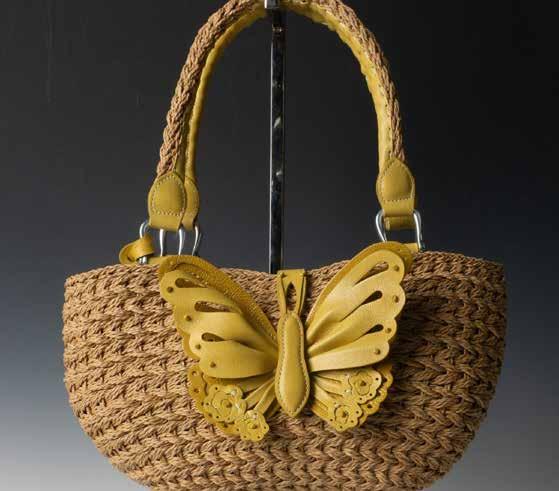 Straw handbag with metal butterfly, leather pink flowers and green leaves. Light tan leather trim and shoulder strap. Interior pockets with fold over magnetic closure. Length of leather shoulder strap is 10”L. Brighton logo leather patch stitched on the inside.