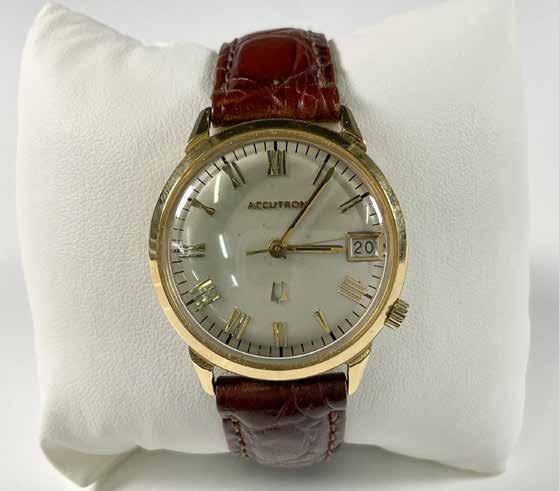 This gorgeous stainless steel wristwatch has dark red genuine leather strap. The face has gold quartz surface with gold numbers. This item has its original box 6”L x 4.5”W x 3”H.