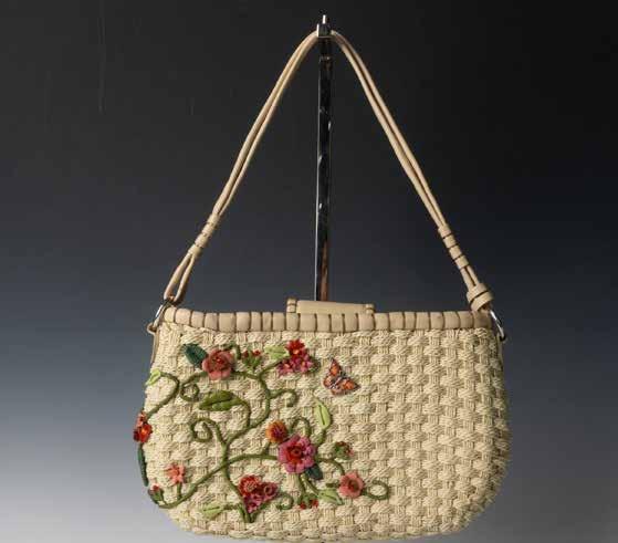 This charming handbag has natural fiber woven exterior embellished with beautiful colorful leather flowers. The magnetic closure opens to fabric lining and additional pockets. Leather handles in a cream color. Brighton embossed tog on the inside. Dust bag included.