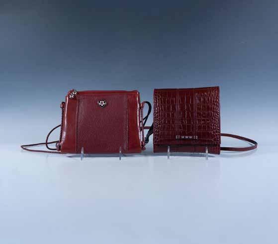 These two crossbody bags are packed with organizational sections, including wallet compartments. The smaller bag has an alligator texture in its pebble leather exterior, while the larger one, features a smooth pebble leather finish, both bags in red. The largest bag measures 8.25” L x 1.25” W x 7” H.