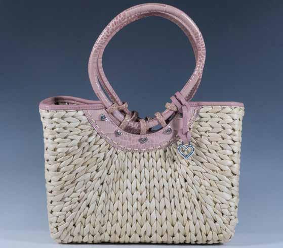 a natural fiber woven basket type bag finished with pink leather top and handles. Fabric lined interior with zippered pocket. Brighton embossed tag inside. Dust bag included.