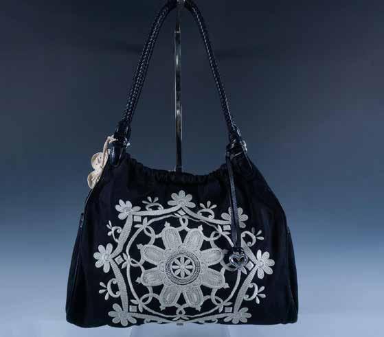 This Boho-style bag features bold medallion in white over a black background. The magnetic closure top opens to fabric lining with pockets. Black leather braided shoulder strap and leather flower hang tag. Brighton embossed number U081411.