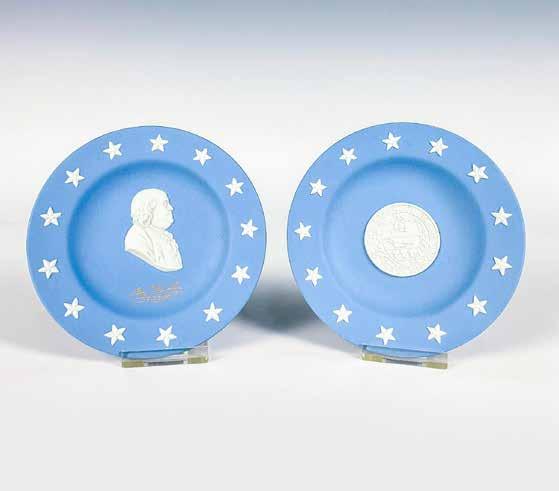 Pale blue compotiers made to commemorate the Bicentennial of American Independence. Decorated in a white relief with the state seal of Pennsylvania and Benjamin Franklin, the states rep who signed the declaration of independence. Wedgwood impressed backstamp. This item has its original box. Box measures: 9.25”L x 4.75”W x 1.25”H