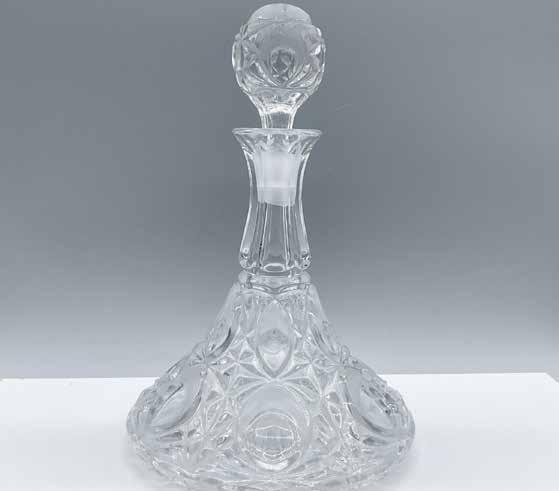 Beautiful clear crystal, elegantly adorned in a facetted crystal Art Deco style. It features a captivating blue diamond pattern that gracefully accents both the body and the base. Unmarked.