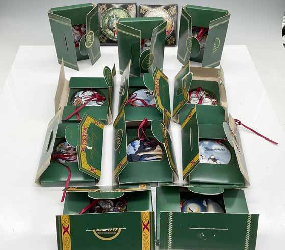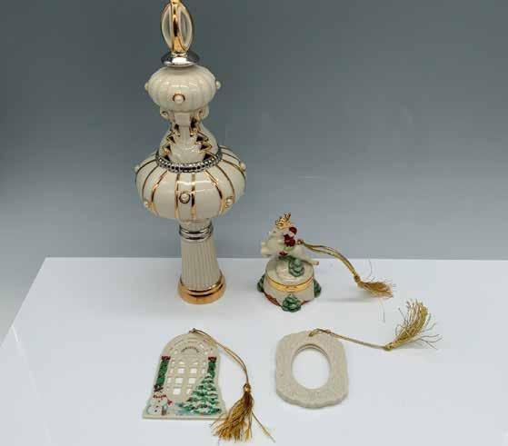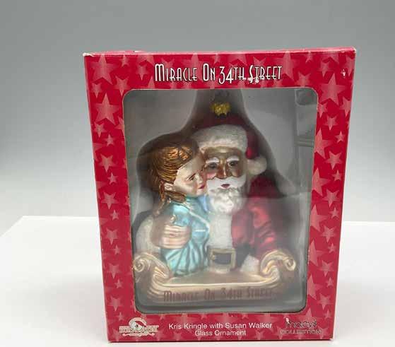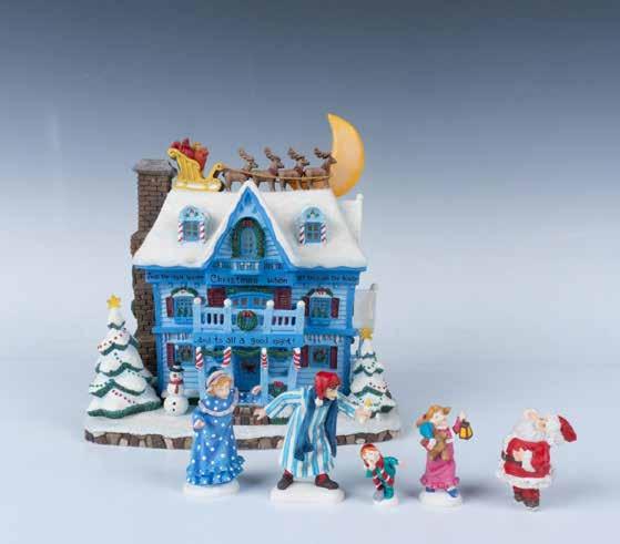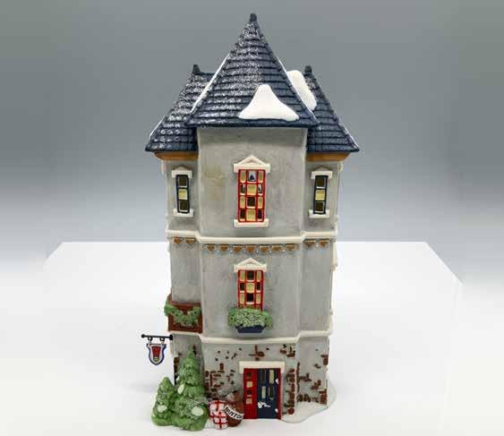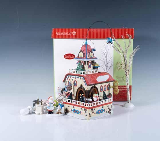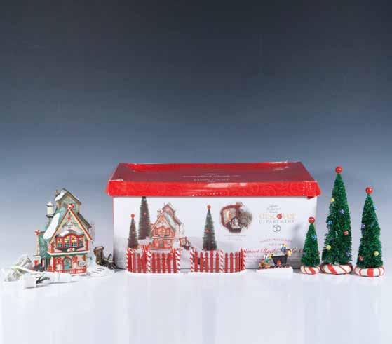 This hand painted gift set has the porcelain building and figurine with two glitter sisal trees. The main building measures 10.25”L x 6.5”W x 8.75”H. Department 56 backstamp. It comes with its original box, which measures 11.5”L x 13.25”W x 13”H. Includes the light kit and power adapter.
