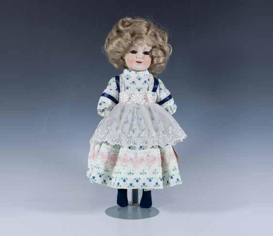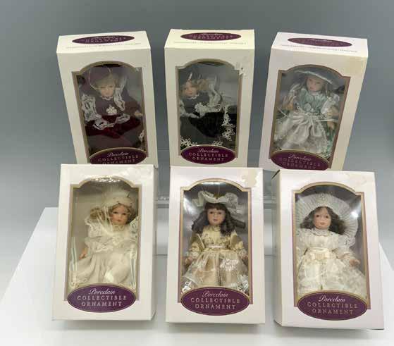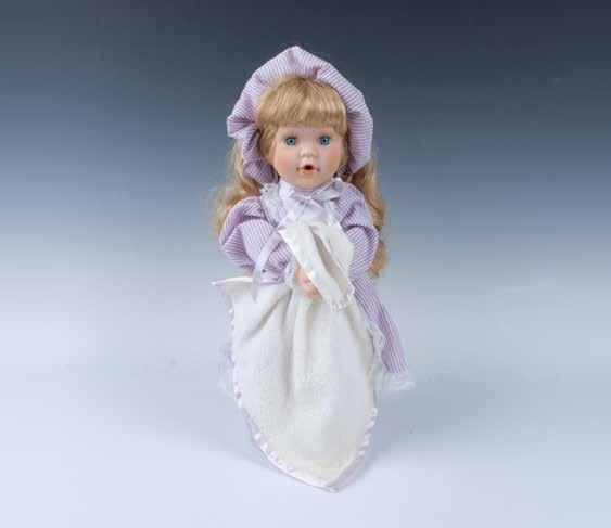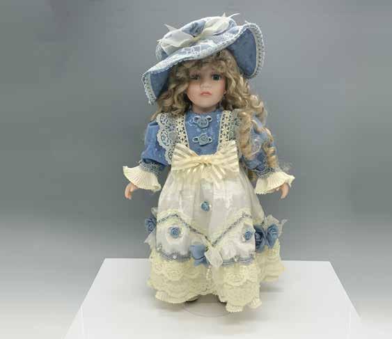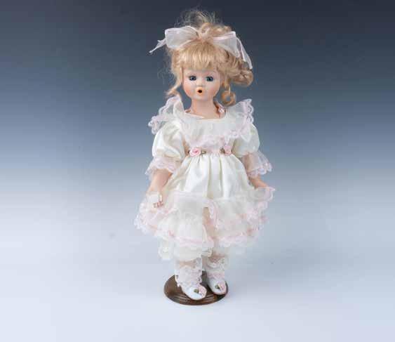 This piece features a porcelain, hand-painted face and head, dressed in a beautifully birthday party dress. Doll measures 6.5”L x 4.5”W x 17.5”H. This item has its original box which measures 9”L x 6.5”W x 19.75”H.