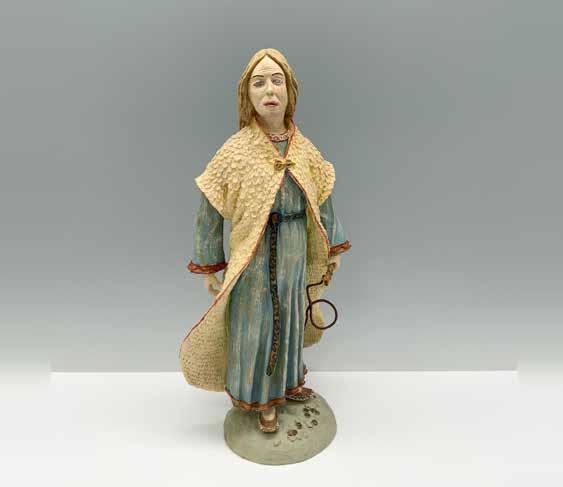 Large figure of a blonde young girl donned in an elaborate and stunning blue and white dress with flowers and lacy edges. Metal stand included. Certificate of authenticity sewn on the back.