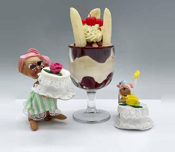 Features 1 realistic resin banana split on a glass and 2 small rat dolls, both holding a cake. The dolls have Annalee tags. Largest measures, 4”L x 4”W x 6”H.