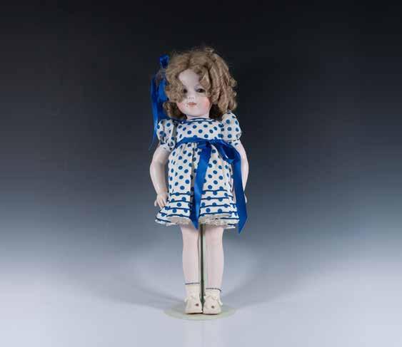 Charming figure of a young beloved Hollywood actor wearing a lacy dress. Includes a Debbie Hawk tag and a button that says An Original Shirley Temple Doll as well as a metal stand.