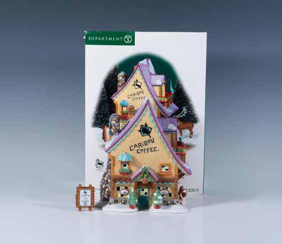 This is the colorful and adorable hand painted porcelain figurine of the Caribou Coffee Shop with sidewalk sign included. UPC #734409191617. This item has its original box that measures 7.5”L x 6.25”W x 10”H.