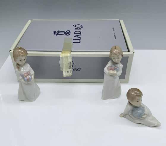 Young girl with long blonde hair dressed in lavender and white striped dress, kneeling in prayer. Display stand included. The Heritage Collection tag. This item has its original box: 7.25”L x 4.5”W x 14”H.