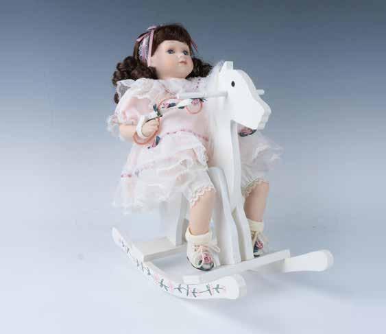 Adorable brown-haired girl in ruffled pink and lace dress sitting on her white rocking horse. Heritage Signature collection backstamp. 12266. This item has its original box: 8.25”L x 7”W x 13”H.