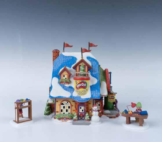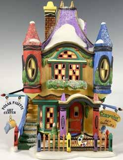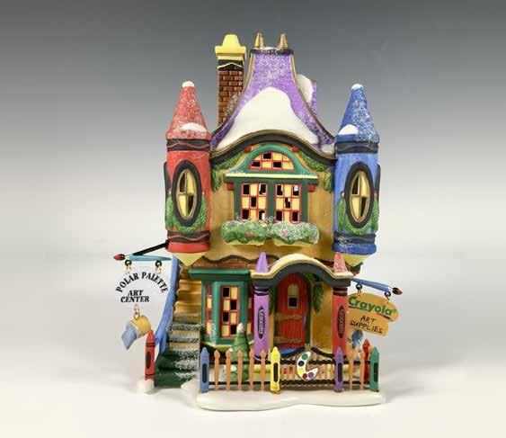 Hand painted porcelain building, the Polar Palette Art Center features crayon shaped columns and vibrant snow covered roofs. It includes a Crayola Art Supplies sign hanging on the side and a playful entrance, making it a standout piece in any Christmas village. This item has its original box. Box measures 6.5”L x 6”W x 11”H. Department 56 backstamp.