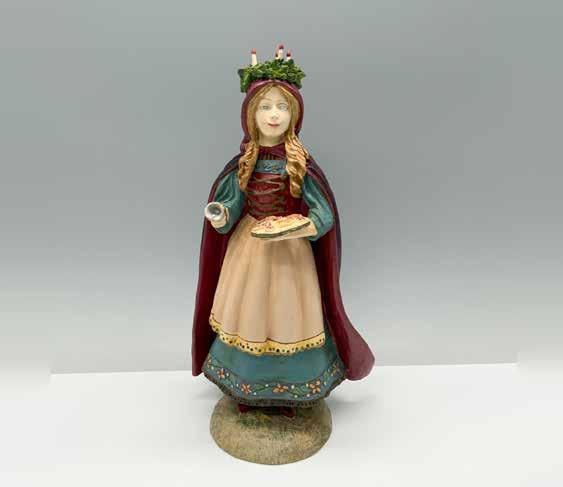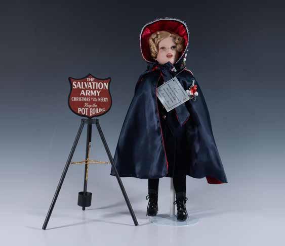 Styled in Salvation Army blue satin attire with hooded cape coat and adorned with holly. Salvation Army collection bucket and metal stand included. Danbury Mint tag. This item has its original box: 7.5”L x 4.5”W x 20”H.