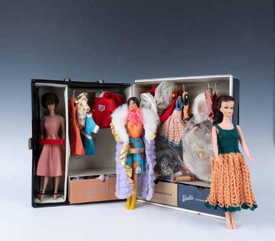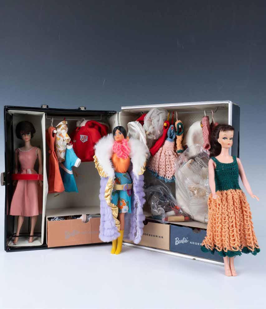 Lovely collection of wardrobe and accessories to model on your dolls that consists of a Barbie with a bubble cut hairdo (Barbie backstamp) and her doll friend, clothing with hangers, and two bags of accessories as well as three storage compartments and a stand for Barbie. Largest item measures 11.5”H. This item has its original box 10.25”L x 7.25”W x 13”H.