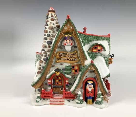 Hand painted porcelain building, the Hand Carved Nutcracker Factory features a rustic stone and wood structure with snow dusted roofs, a large chimney, and a nutcracker by the entrance. A hanging sign and woodpiles enhance its woodland charm. This item has its original box. Box measures 8.25”L x 6.5”W x 9.5”H. Department 56 backstamp.