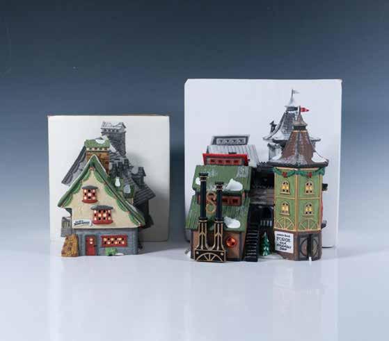 This pair of figurines includes Elf Bunkhouse #5601-4 and Elfin Forge & Assembly Shop #56384. These items have their original boxes, the largest measures 9.75”L x 6.25”W x 10.25”H. Department 56 backstamp. The largest figure measures 8.25”L x 5”W x 9”H.