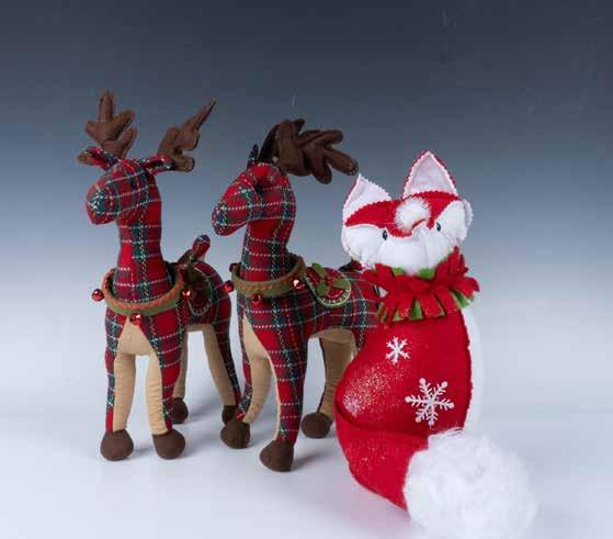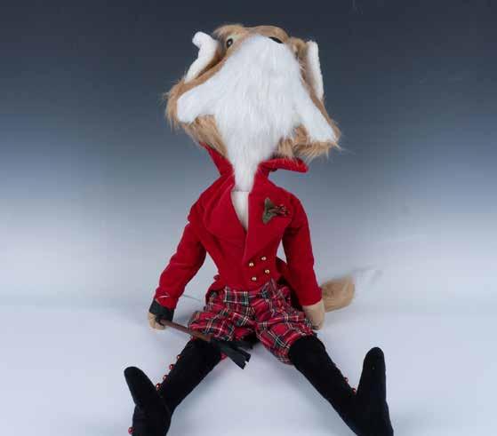 Magnificent figure of a fox modeling a velvet red jacket with a holly corsage and plaid red pants while holding an equestrian riding crop. Gallerie II tag around wrist.