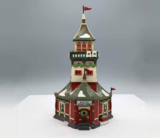 Hand painted porcelain titled Santa’s Lookout Tower from the Heritage Village Collection’s North Pole Series. This building with a unique octagonal base and a tall pointed tower features vibrant red walls, green garlands, gold accents and snow dusted roofs. The windows are illuminated and small red flags adorn the tower, though the left flag is missing. Department 56 backstamp. This item has its original box. 6.25”L x 6.75”W x 12.25”H.