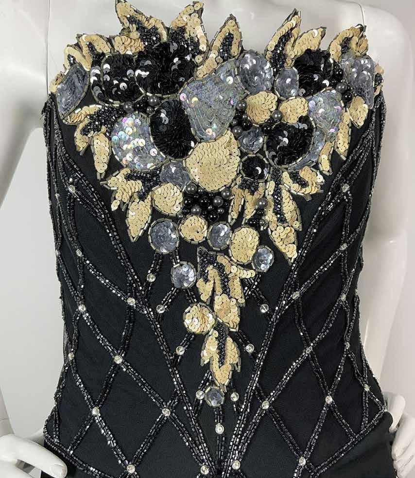 Opulent Bob Mackie Boutique black & silver beaded silk lining evening dress. Features a sleeveless bustier top with embroidered black, clear and cream color beads with sequined patterns on the top, and flowing pleads below the waist. Includes labels for Bob Mackie and Neiman Marcus. Size 10. Bustier length: 17’’W; Waist: 14”W. Dress length: 53’’L. All measurements are approximate.