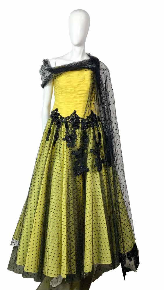 Gorgeous original Kris Cole black tulle and yellow fabric sleeveless ball gown with a black tulle shawl. Includes a pleated bodice, and black tulle embroidered with sequins and beads below the waist line.