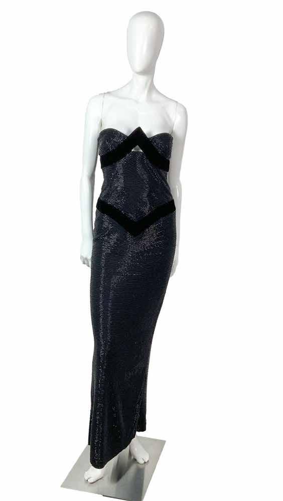 Understated elegance with this oneof-a-kind Bill Blass sleeveless black evening gown made of intricate hand-beaded linear patterns divided by luxurious black velvet bands on the bustier and around the waist. Label: Bill Blass. Made in the USA. Chest: 15”L; Waist: 14’’W. Dress length: 51’’L. All measurements are approximate.
