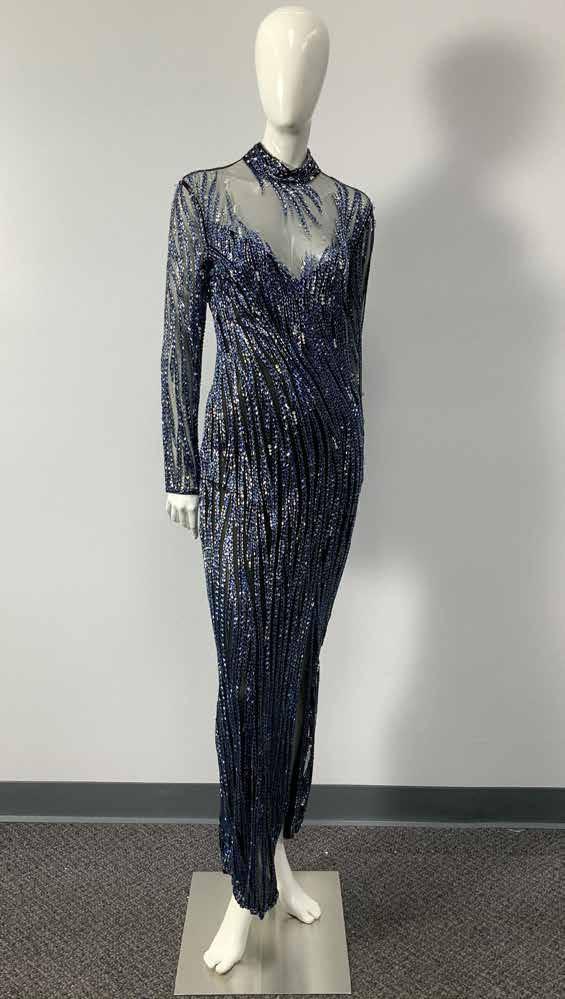 A dazzling, floor length, high neckline silk dress embellished with blue and silver colored sequins and beads on black chiffon. Size: 8. Bust: 16”W. Waist: 13.5”W. Sleeve length: 23.5”L. Full length: 59.5”L. All measurements are approximate.