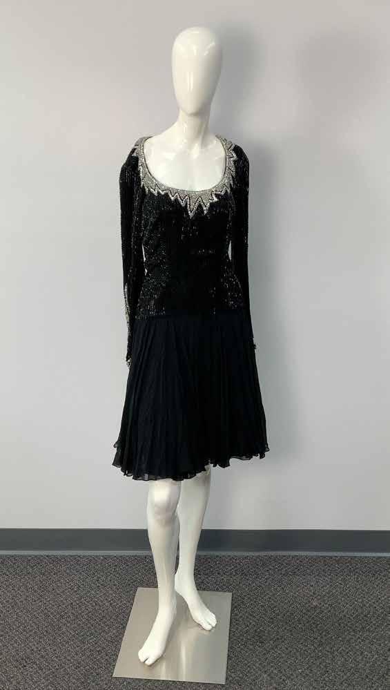 Opulent Bob Mackie Boutique black & silver beaded silk cocktail/ evening dress. Features a low scooped neck with embroidered silver color beads, similar design on lower parts of sleeves that close with small zippers, black beads above the waist, on the sleeves, and the back, and flared flowing pleads below the waist. Includes labels for Bob Mackie, Neiman Marcus, and Engie. Size 8. Shoulders: 16”L. Sleeves length: 22’’L; Bust: 17’’W; Waist: 15”W. Dress length: 40’’L. All measurements are approximate.