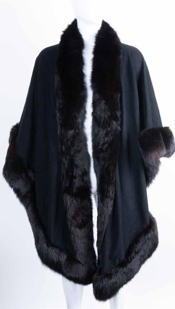cashmere mid-length cape with deep brown fox fur trim. Engie and Furs International Ltd. Labels.